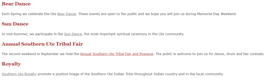On the Mountain Ute Tribe’s website, they also have a list of their ceremonies and other cultural/religious traditions as pictured in this image of their website.